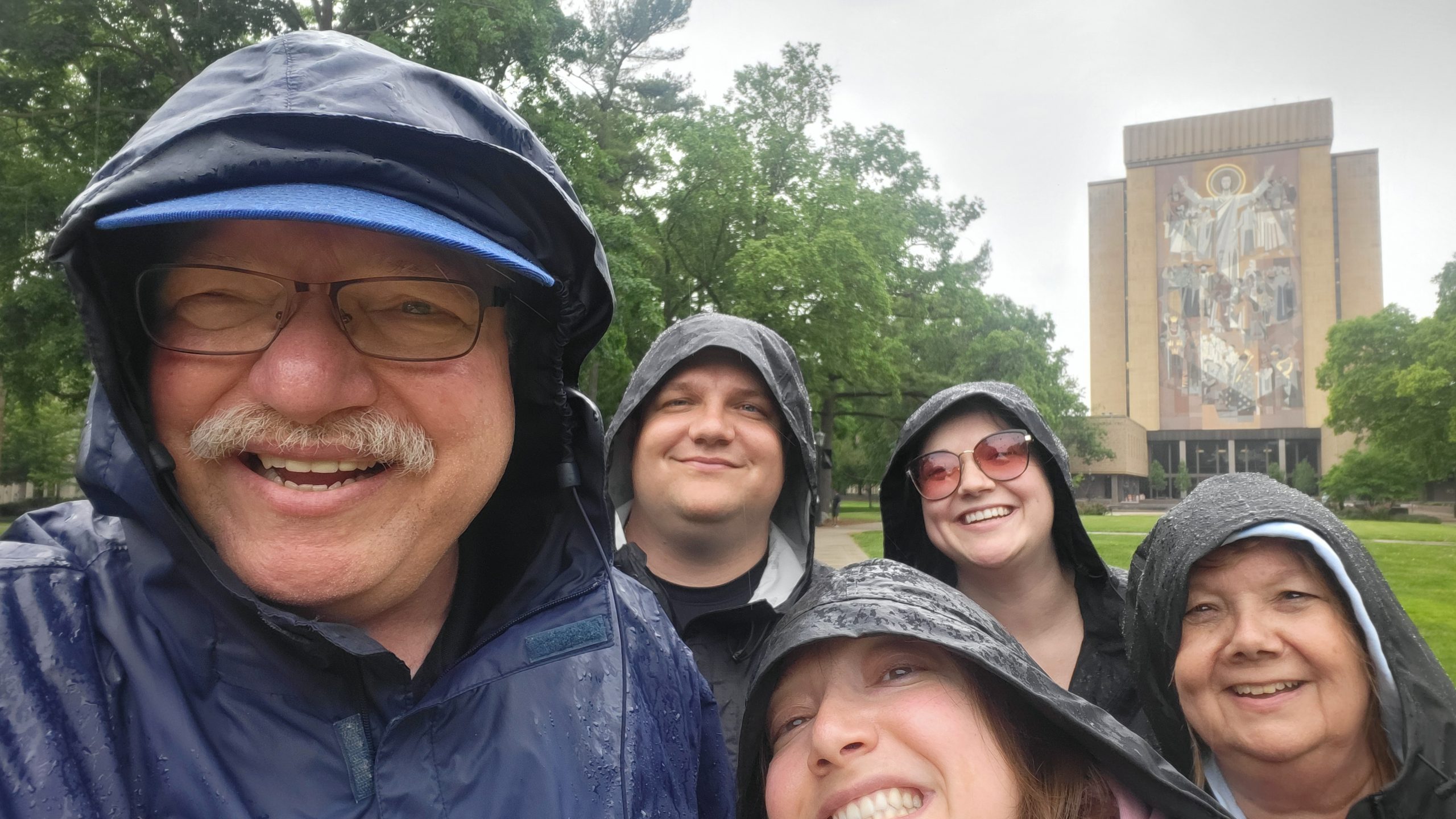 And then it started to rain. A drizzle at first. Then buckets. Just in time for our stop in South Bend, Indiana, and our meeting with “Touchdown Jesus.”